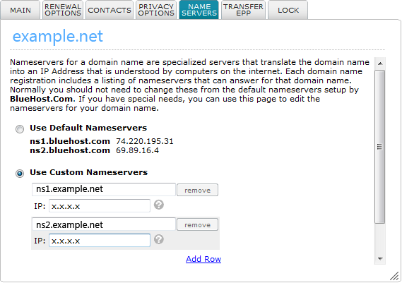 Enter yoru desired nameservers here, and the IP(s) you want them to map to. These will be the IP(s) of your server with NDC Host. You can use the same IP for both servers if you only have 1 IP with us. An example configuration would be (x.x.x.x being your IP):