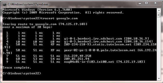 At the command prompt, enter tracert yourdomain.com, where your domain is a domain name on your server or your server's IP address. This will result in something like the following (the first two host lines have been intentionally blanked):
