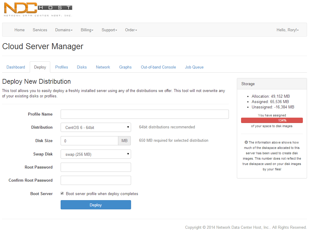 Under Deploy New Distribution, choose any name for the Profile, choose which distribution you would like it to have, fill in the disk size, fill in the swap size, and fill in the root password.